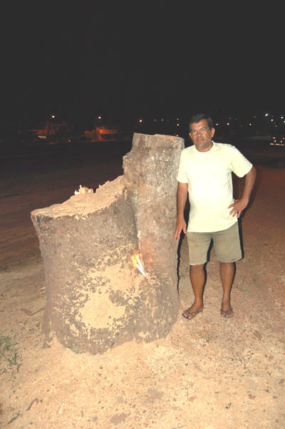 No detalhe, Zezinho Medeiros ao lado do toco e uma vela acesa