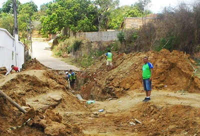 Nossa reportagem passava por acaso pela Avenida JK, no bairro Sítio dos Ingleses, ao meio dia deste sábado 17, quando viu em meio ao sol de rachar o gerente local da Caema, Nonato Reis, comandando pessoalmente a obra de substituição de dois canos que estouraram há três dias.