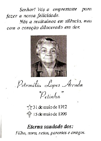 De personalidade marcante, dona Petinha com sua maneira de ser, sempre acolhedora e gentil, cativava a todos e sua lembrança ainda é uma presença entre a família e amigos.