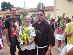 Frei Pedro ao lado de uma senhora que fez um arranjo
