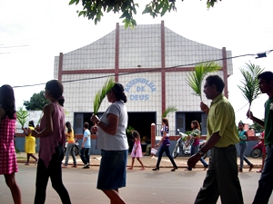 Fies Católicos passam em frente a igreja Assembléia de Deus